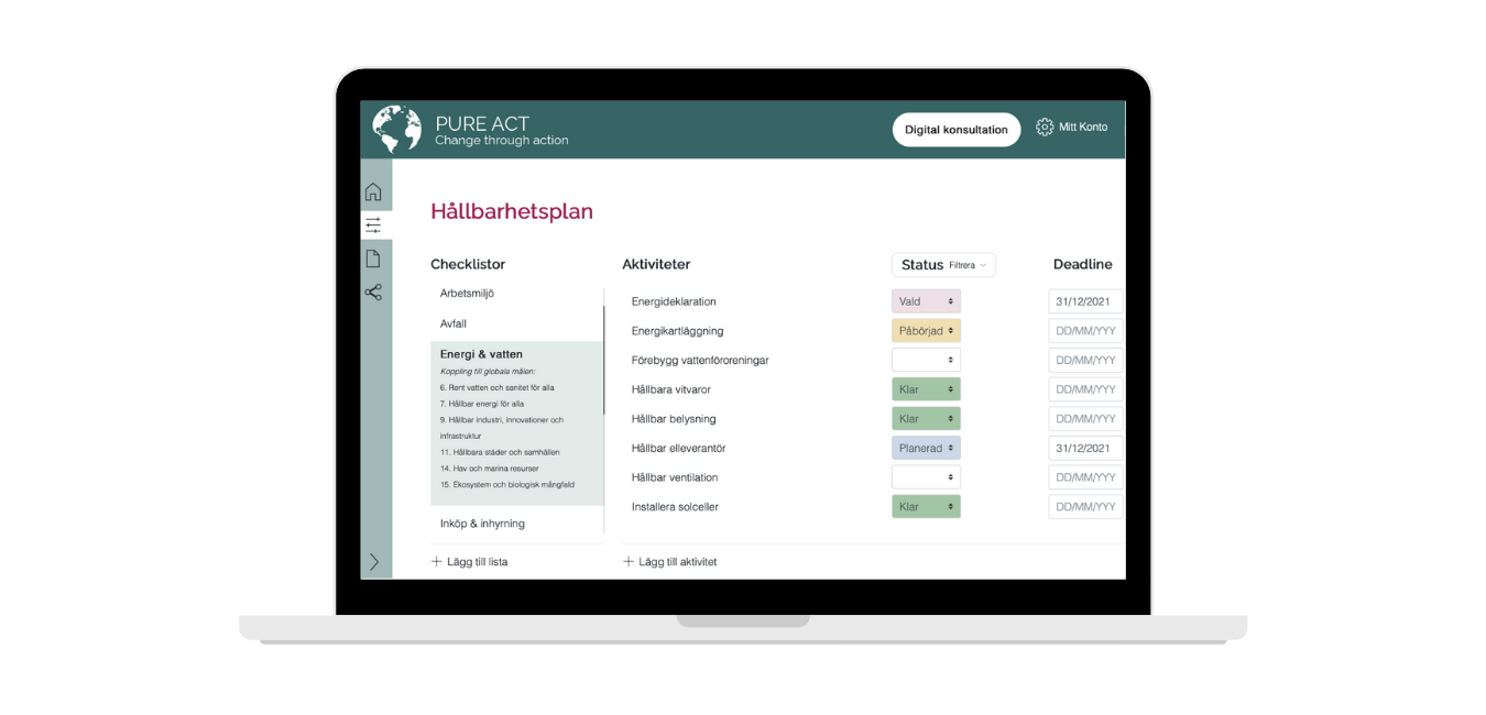 Acture är ett aktivitetsbaserat system där du bygger en hållbarhetsplan med tydliga kort- och långsiktiga mål samt KPI:er. I systemet skapar du även kompletta underlag till din hållbarhetsrapport. Systemet effektiviserar hållbarhetsarbetet och underlättar måluppfyljning. Acture består följande moduler: