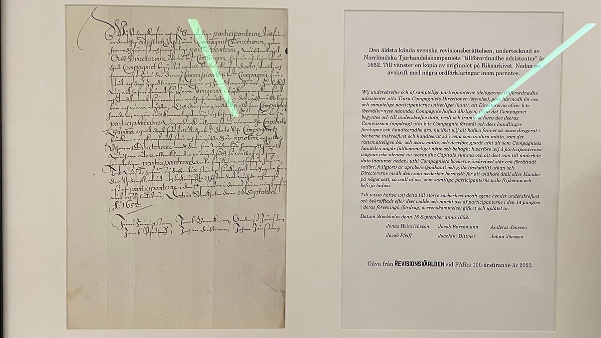 Sveriges äldsta revisionsberättelse finns i original på Riksarkivet. Denna kopia och avskrift är en gåva från Revisionsvärlden till FAR i samband med organisationens 100-årsjubileum.