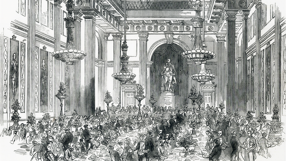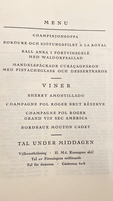 Till detta bjöds drycker av ädla slag, men om det fanns vegetariska alternativ eller alkhoholfria viner framgår inte av menyn.
