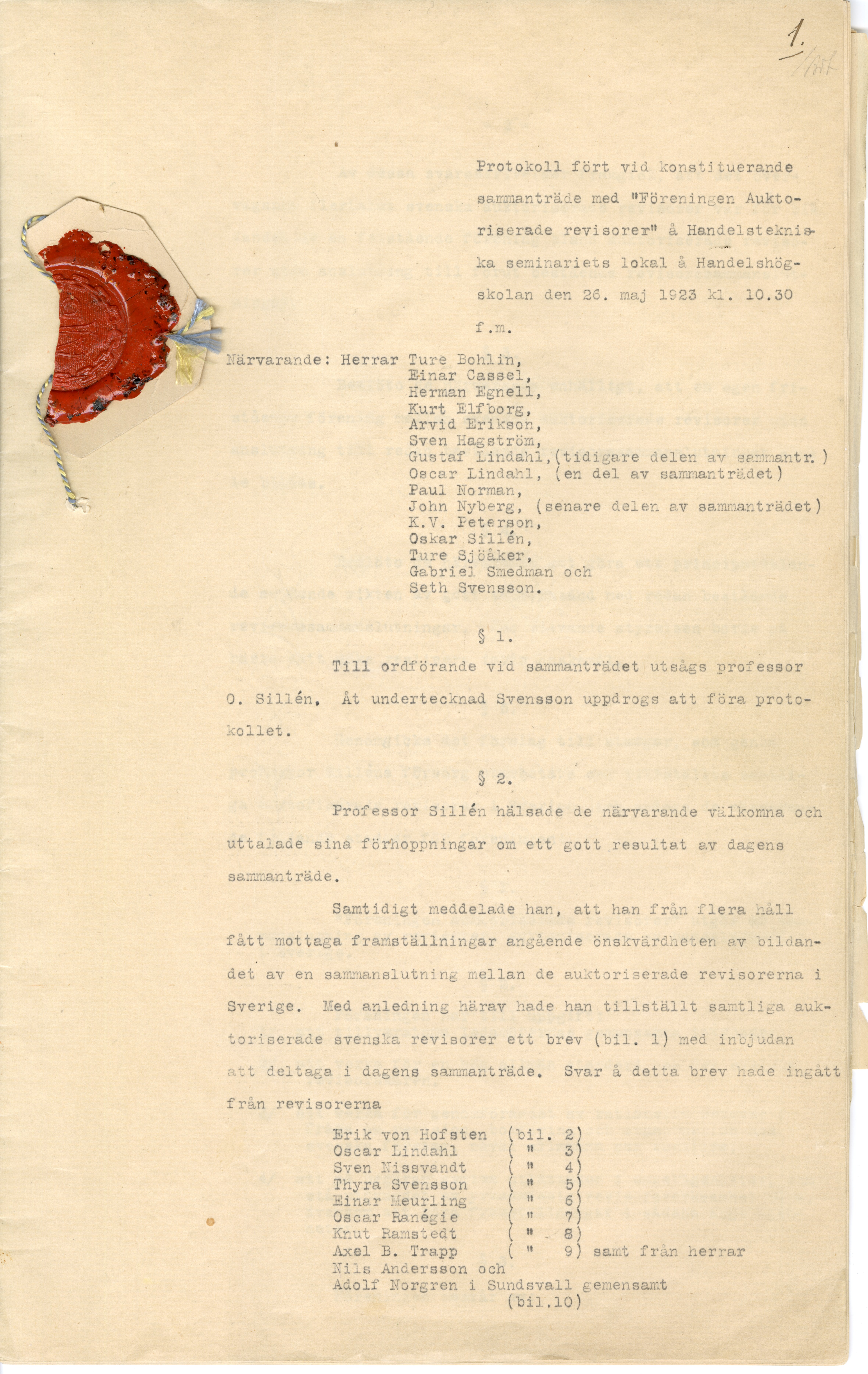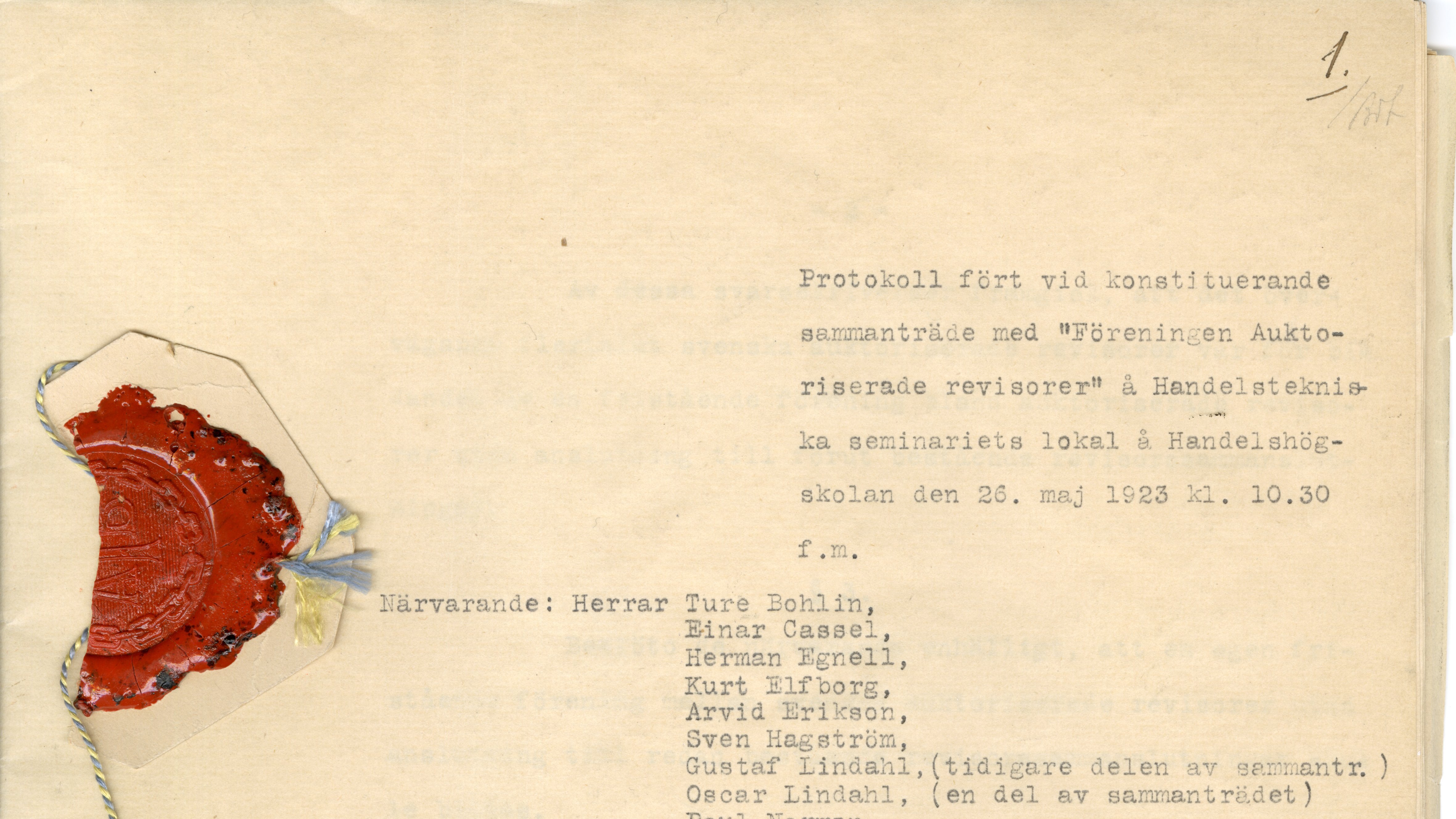 Den 26 maj 1923 klockan 10.30 fm hölls konstituerande sammanträde med ”Föreningen Auktoriserade revisorer”.